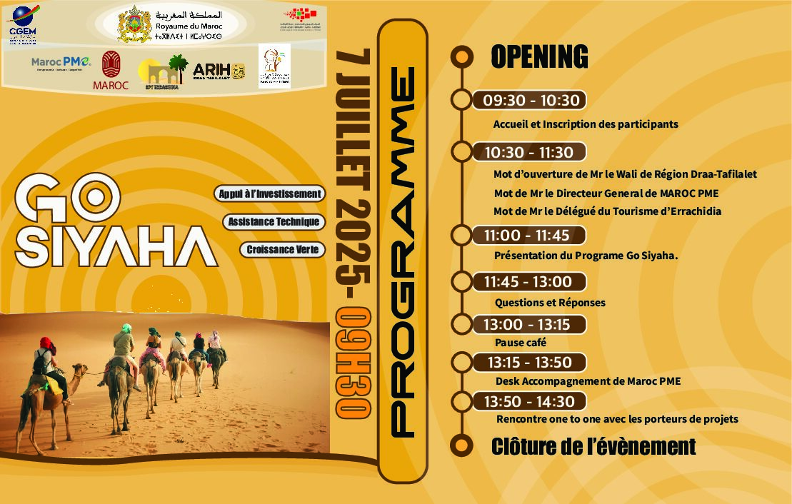 ÉVÉNEMENT GO SIYAHA PROVINCE D’ERRACHIDIA 07 Juillet 2025 Posez votre Question ! Raison Sociale Prénom & Nom Représentant Statut StatutPropriétaireGérantAutre Depot Dossier Depot DossierOuiNon Date de Depot Sujet Question Sujet Question Appui à l'investissement Assistance Téchnique Croissance Verte Autre Votre Question Envoyer